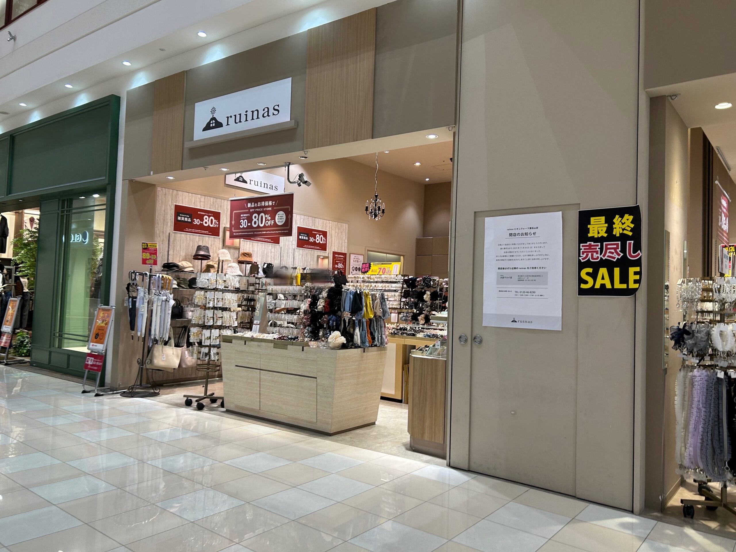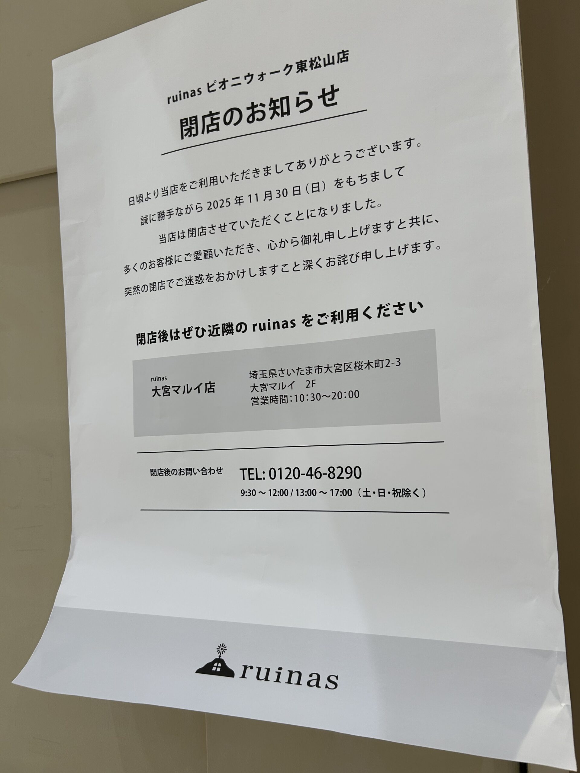 11月30日(日)に閉店の「ruinas(ルイナス)ピオニウォーク東松山店」の情報でした!