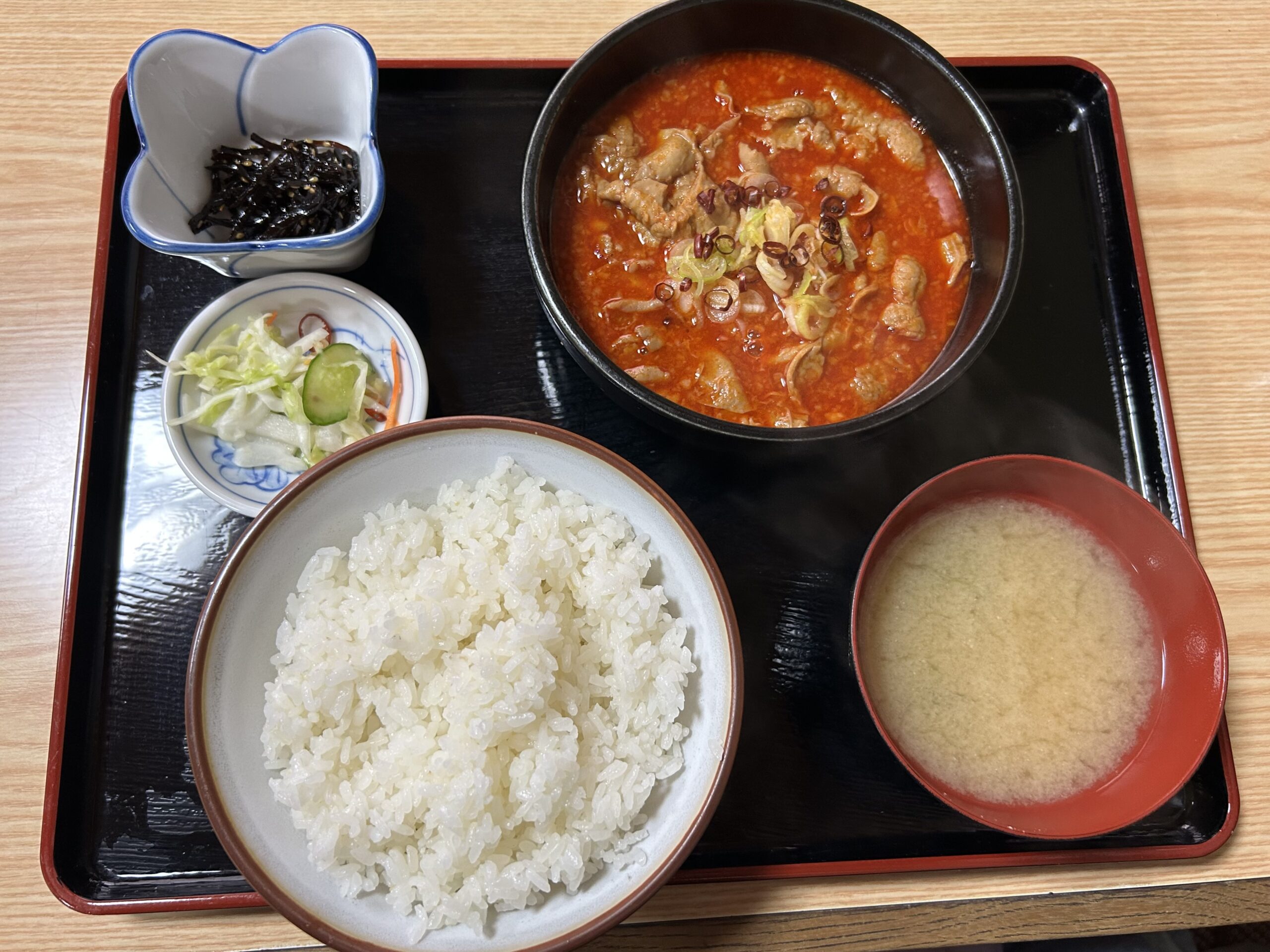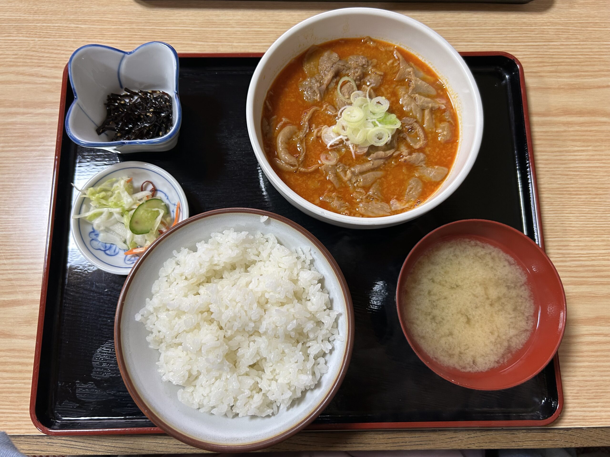 ご飯、もつ煮、味噌汁、お新香、昆布付きです。