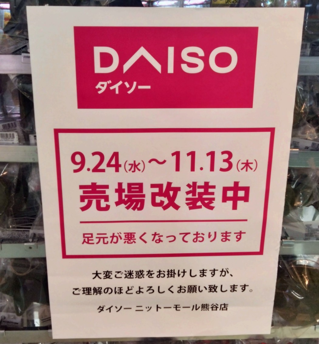 熊谷駅直結のショッピングモール、ニットーモール4階にあるダイソーが、現在売り場を改装中です!
