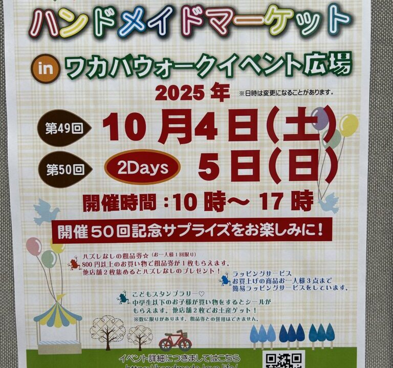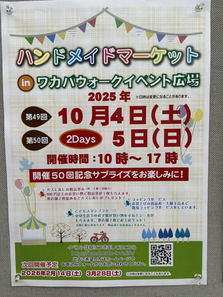 今回はワカバウォークで今週末(10月4日・5日)に開催されるハンドメイドマーケットの情報です。