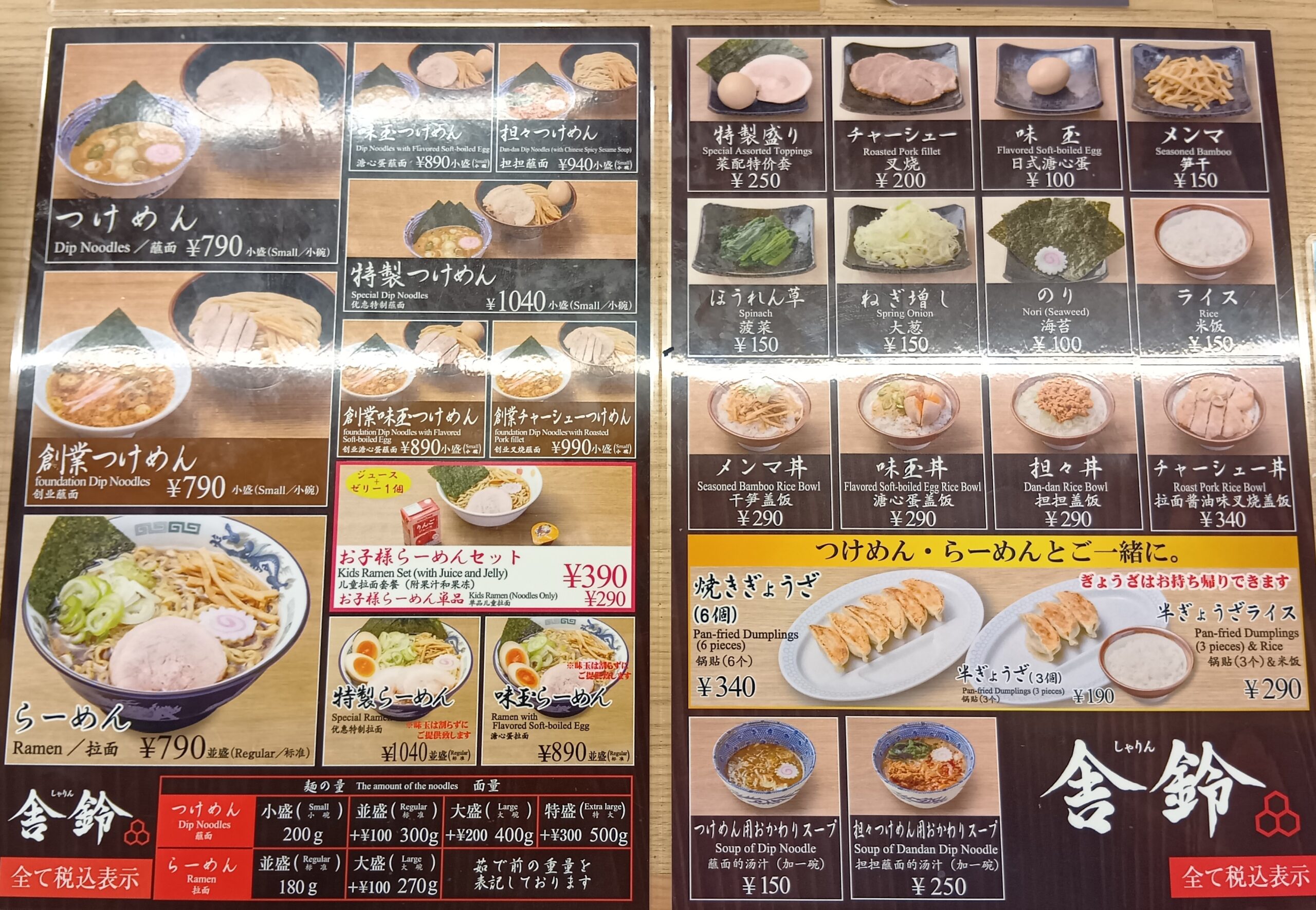 つけ麺 小盛200g 並盛300g+100円 大盛400g+200円 特盛500g+300円
