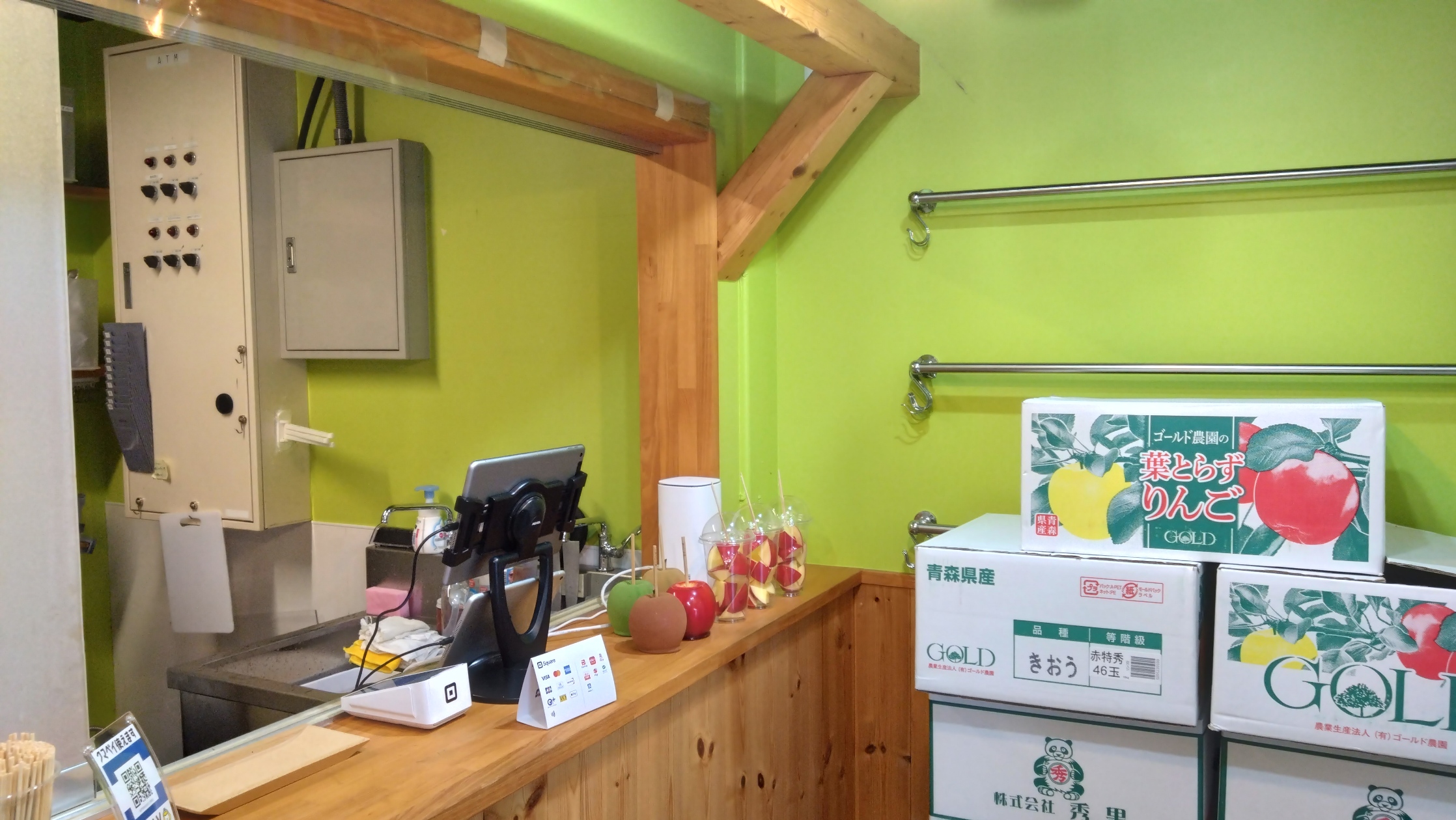 お店の中は、富士林檎をイメージしたカラーでポップな内装です。