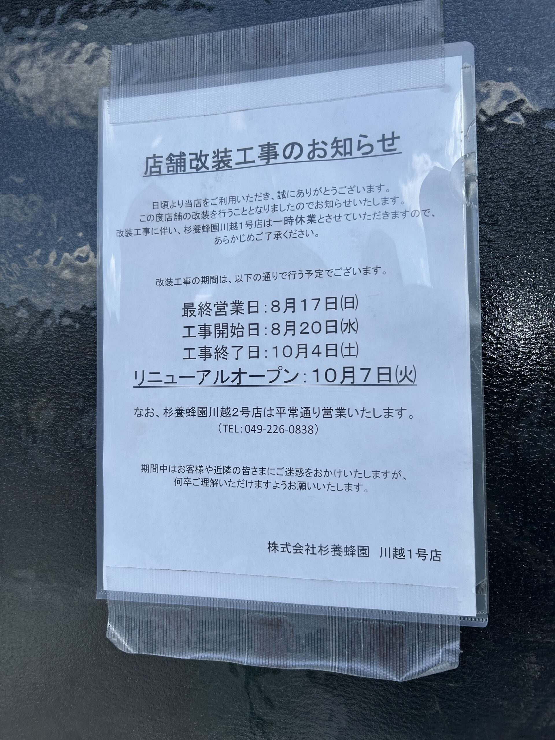 尚、同じ通りにある「はちみつの杉養蜂園 川越2号店」は通常通り営業してます。