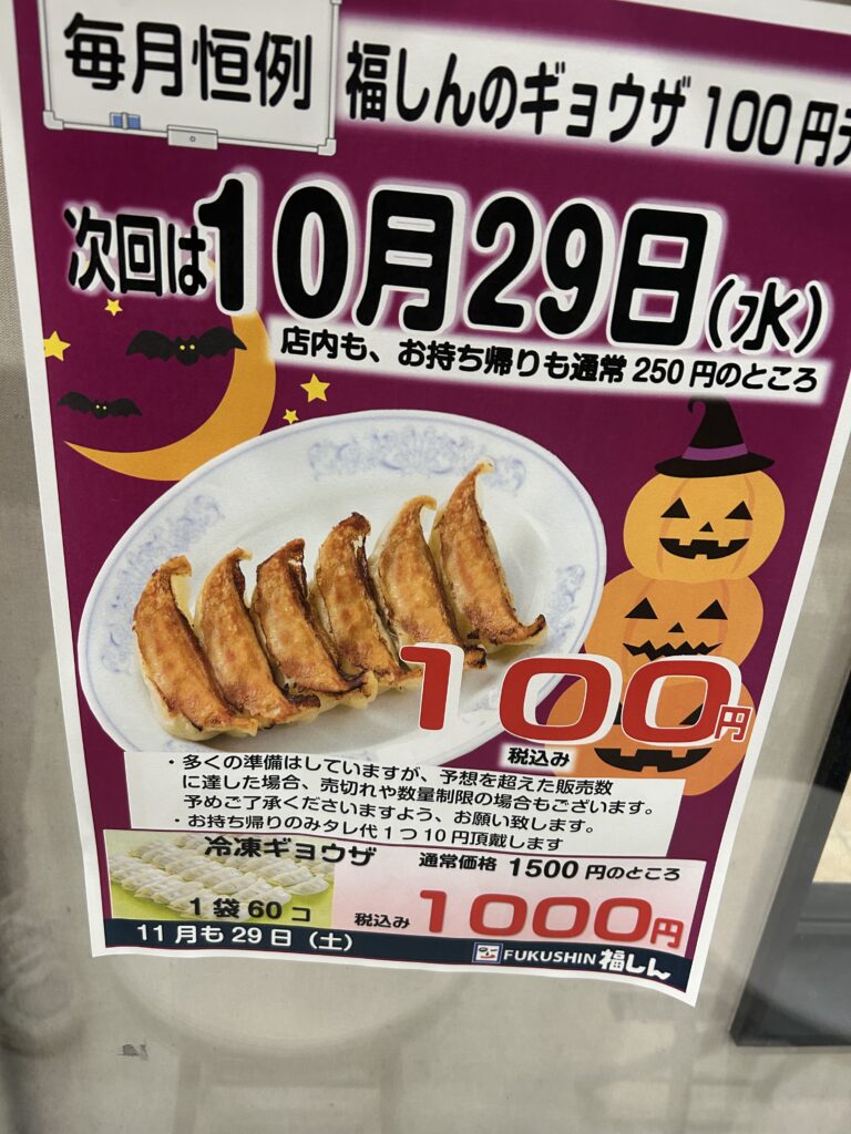 毎月恒例の福しんのギョウザ100円デーは次回10月29日(水)です。