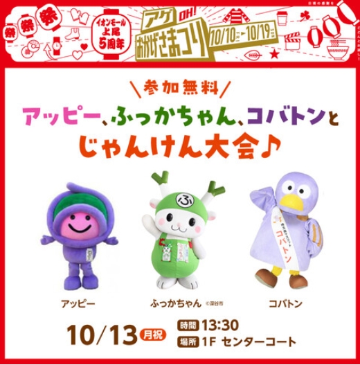 アッピー、ふっかちゃん、コバトンとじゃんけん大会♪は10月13日の開催となります。