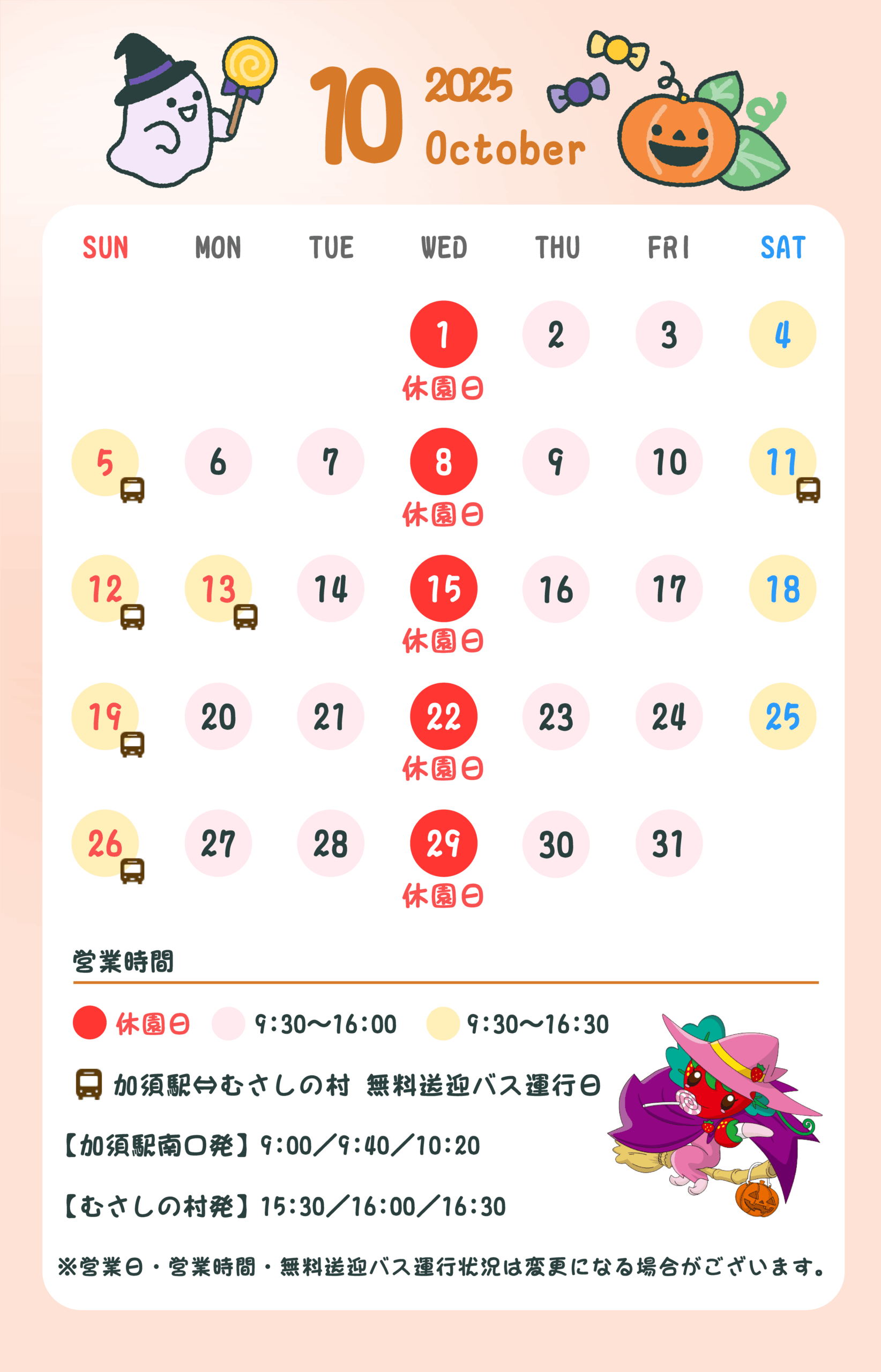 *無料送迎バス(加須駅⇔むさしの村)運行日あり
