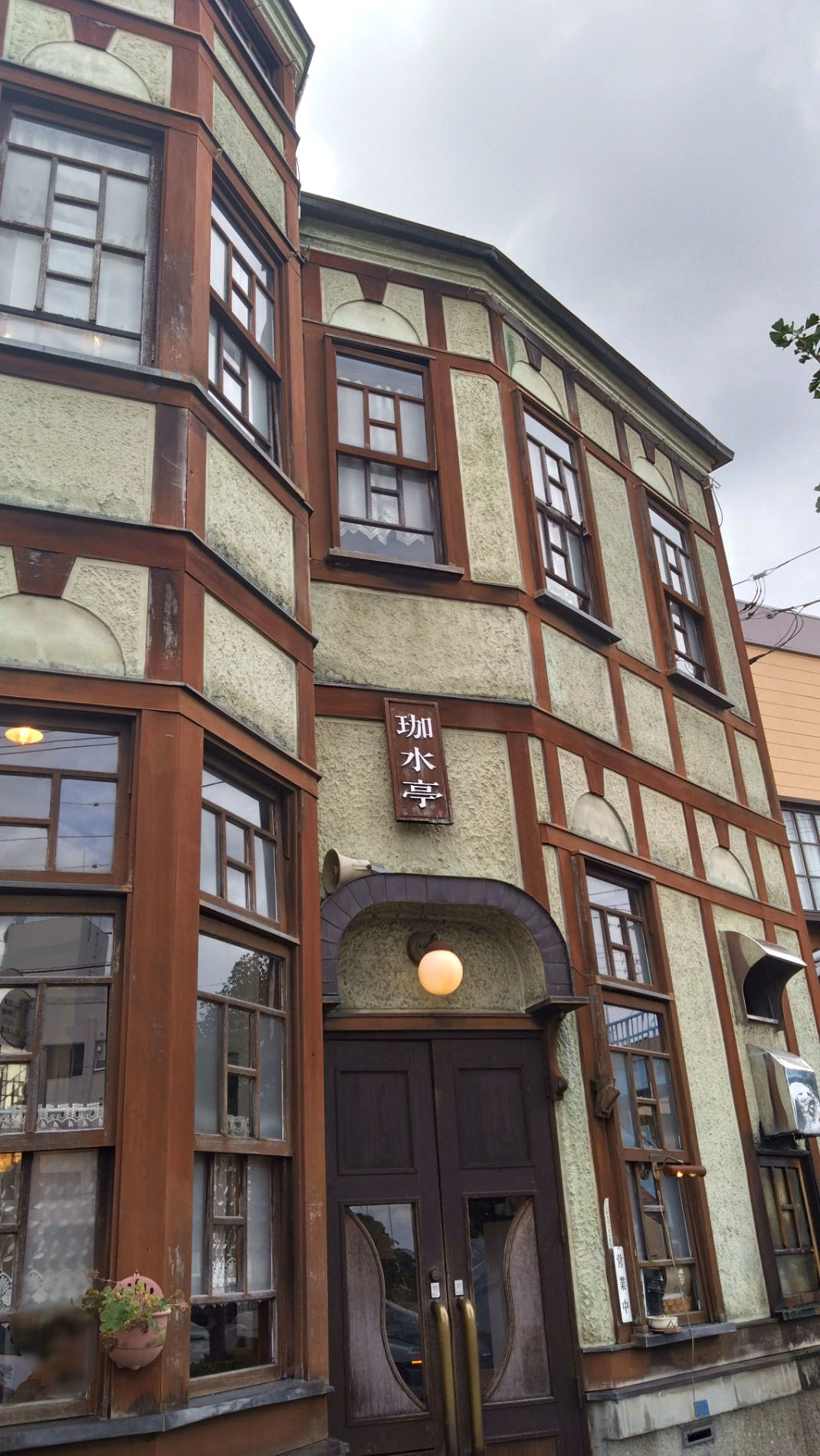 レトロで重厚な洋館風で、入口には「珈水亭」の看板が出ています。