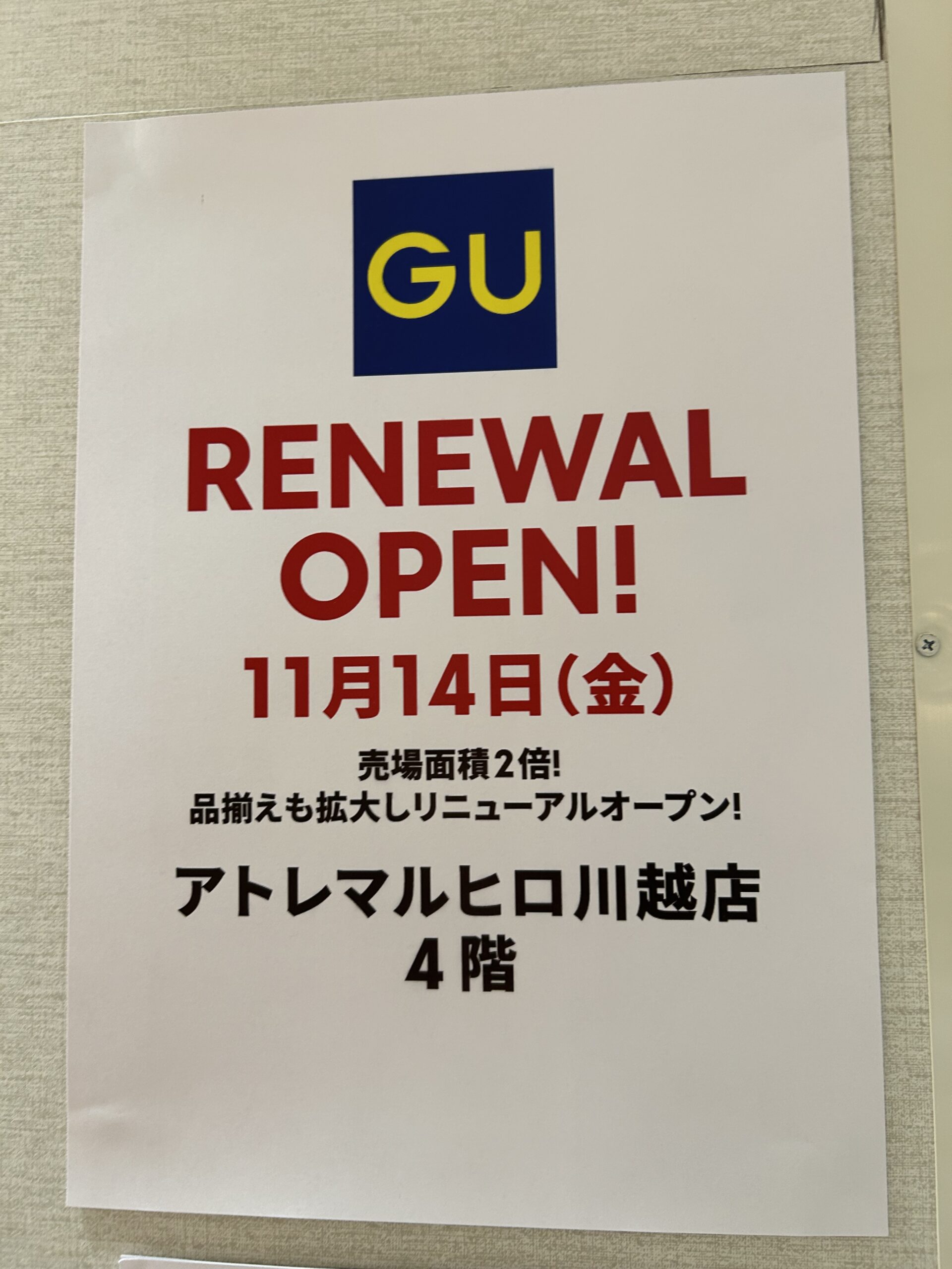今回は、「ジーユー アトレマルヒロ川越店」のリニューアルオープン日が判明したので共有します!