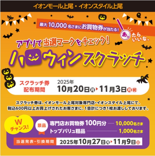 イオンモール上尾対象専門店・イオンスタイル上尾にて、600円(税込)以上お買上げすると1会計につき1枚スクラッチがもらえます。