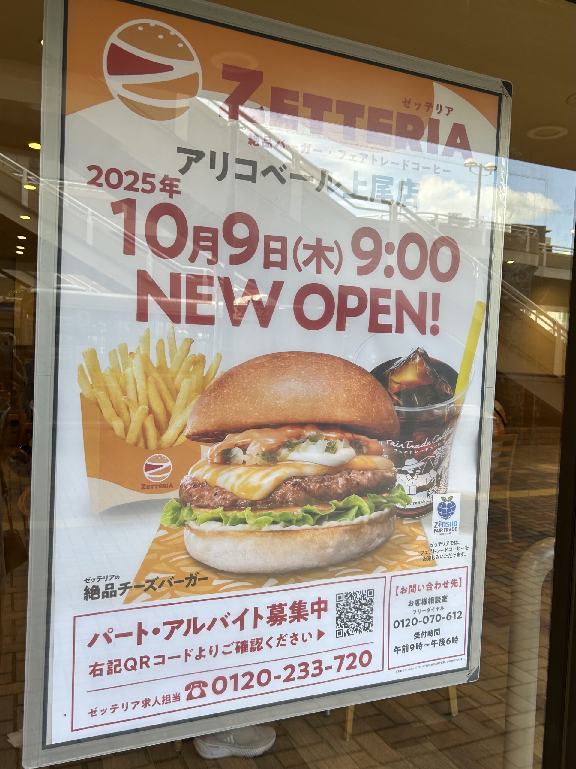 ゼッテリア アリコベール上尾店は2025年10月9日(木)にオープンしました。