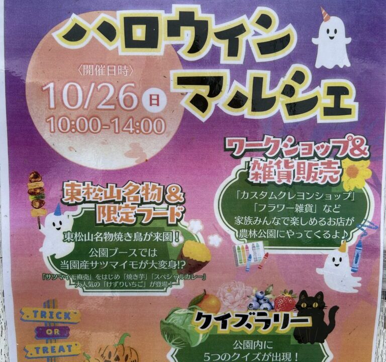 今回は東松山市農林公園で行われる「ハロウィンマルシェ」の情報です。