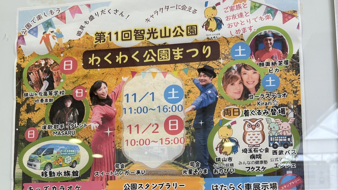 今回は、狭山市で開催される「智光山公園わくわく公園まつり」の情報です。