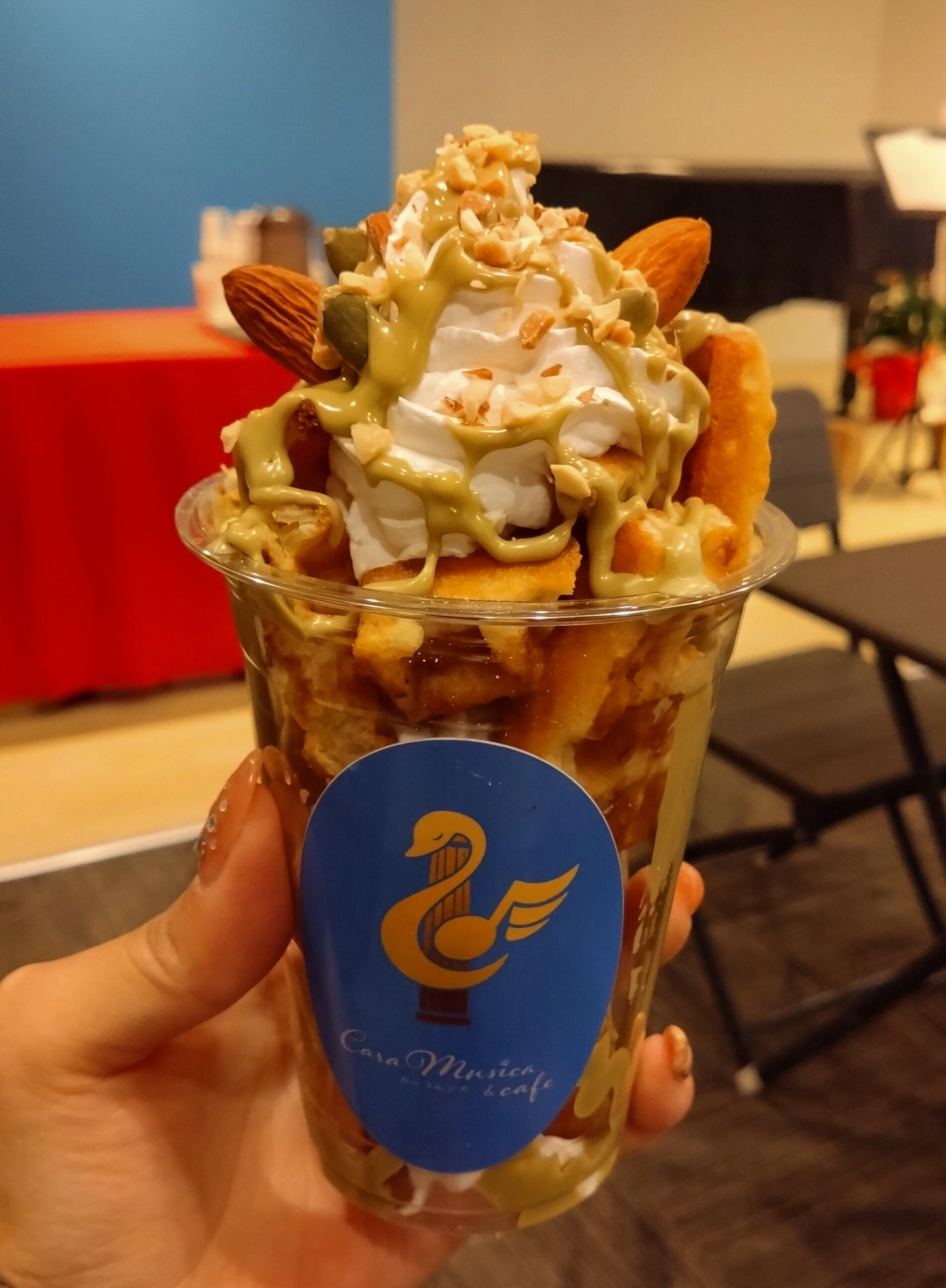 生クリームに絡んだ美しい緑色のピスタチオチョコソースは、一口食べると私には少し甘かったです!温かくてサクふわのワッフルと、中の生クリームと一緒に食べると、ちょうど良い甘さになります♪