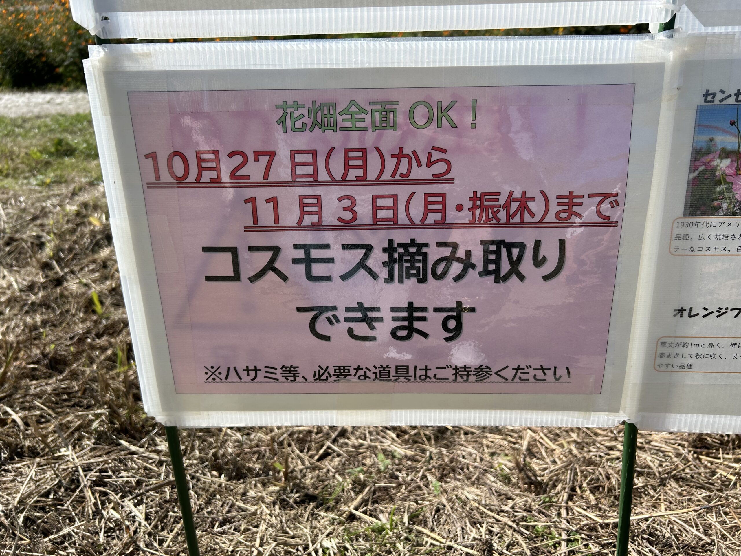 コスモスフェスティバルが、10/25(土)・26(日)に開催し、本日からコスモスの摘み取りがOKになりました♪