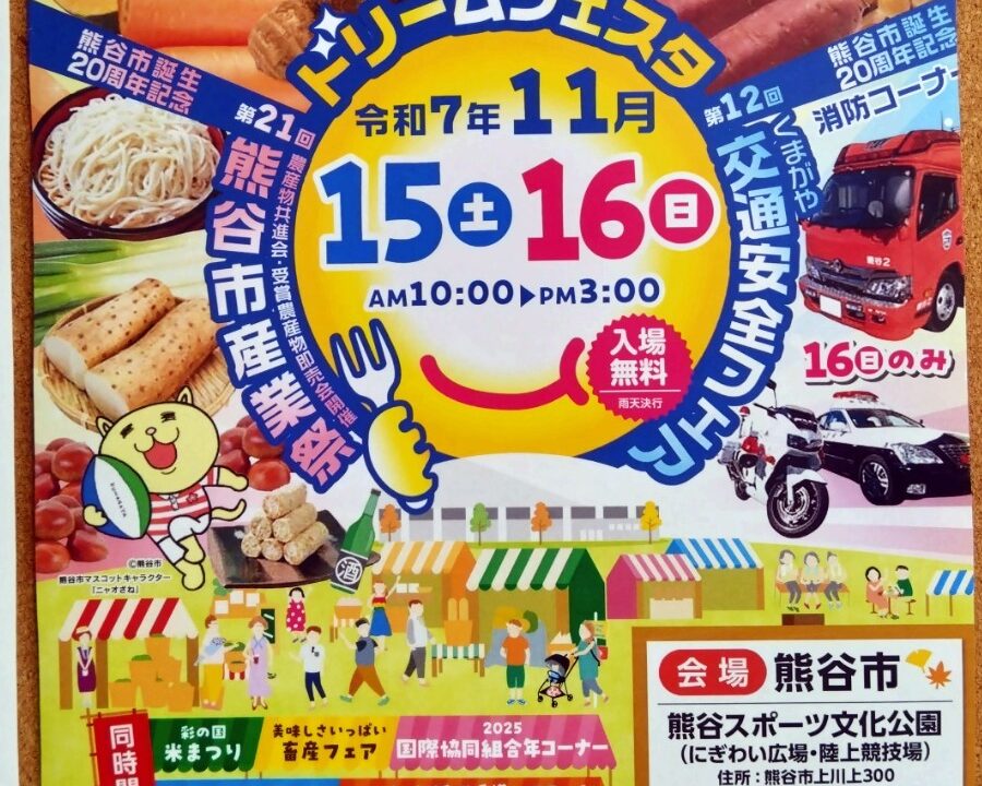| イベント名 | ・第21回熊谷市産業祭 ・2025彩の国食と農林業ドリームフェスタ ・第12回くまがや交通安全フェア |