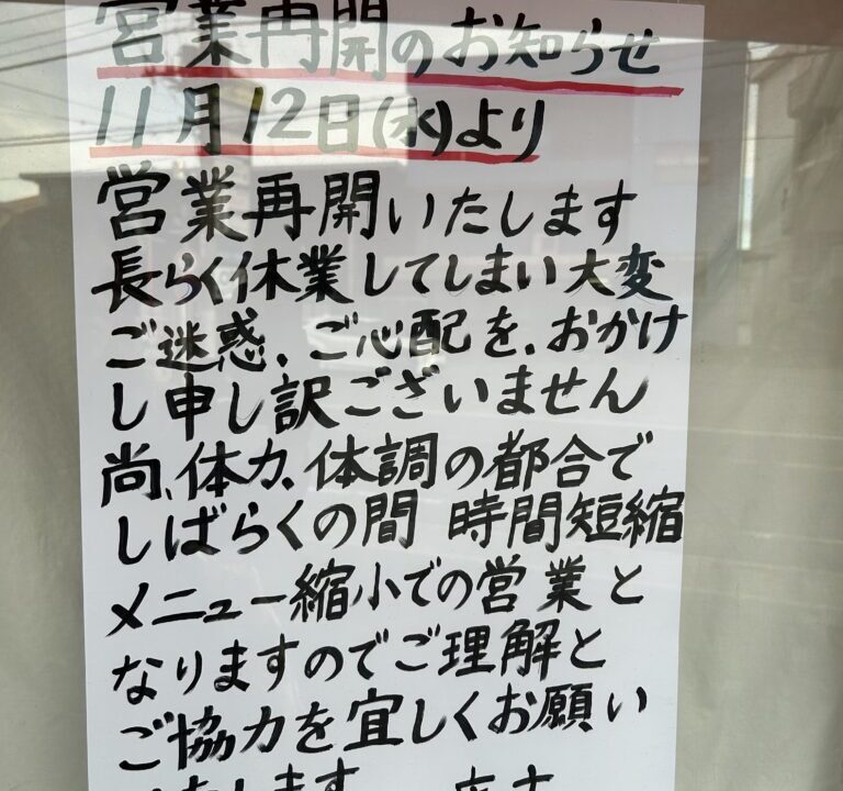 2025年11月12日(水)に営業再開されるとの事です。しばらくの間、時間短縮・メニュー縮小での営業となるそうです。