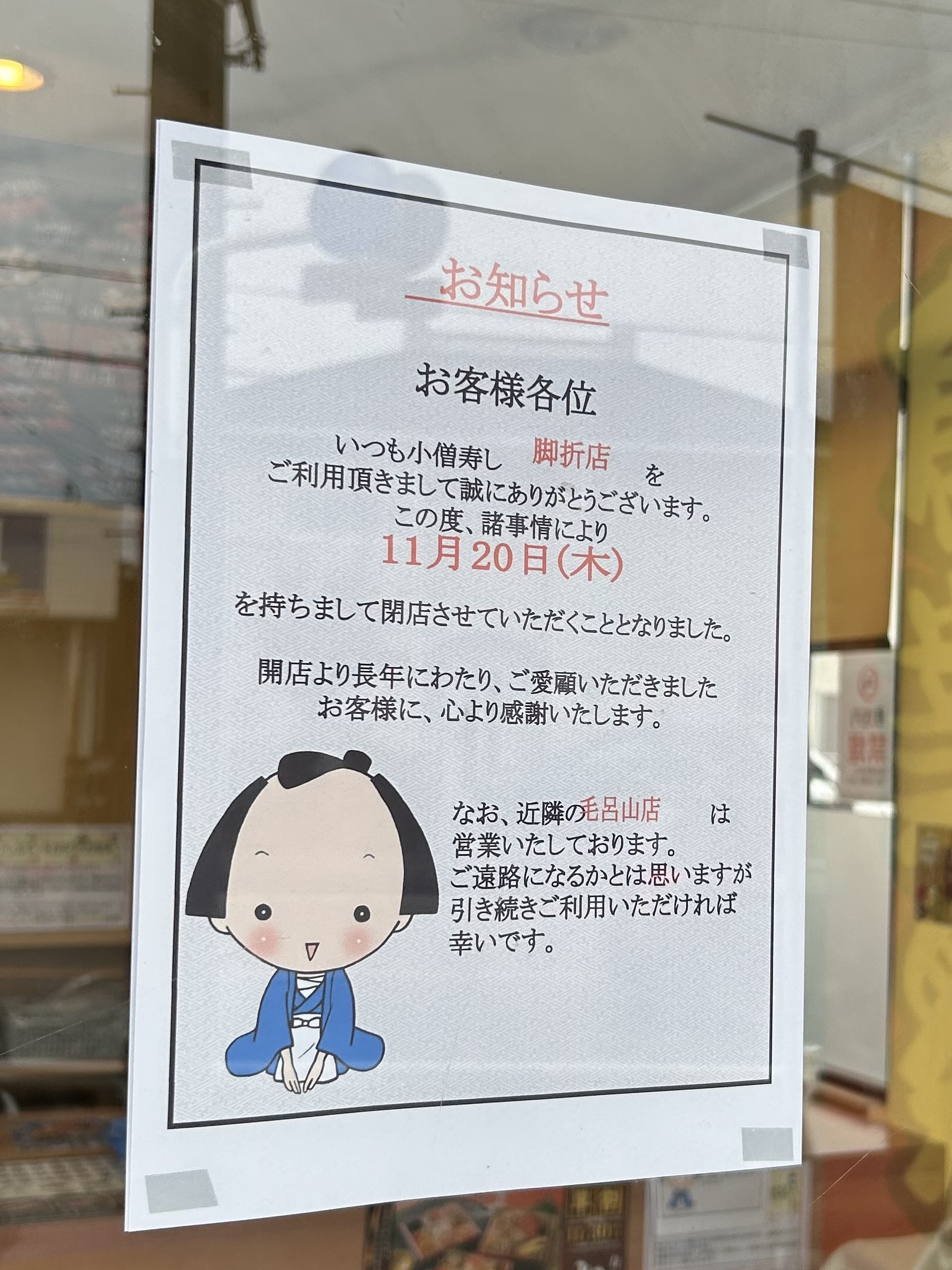 「小僧寿し 脚折店」の閉店情報でした。