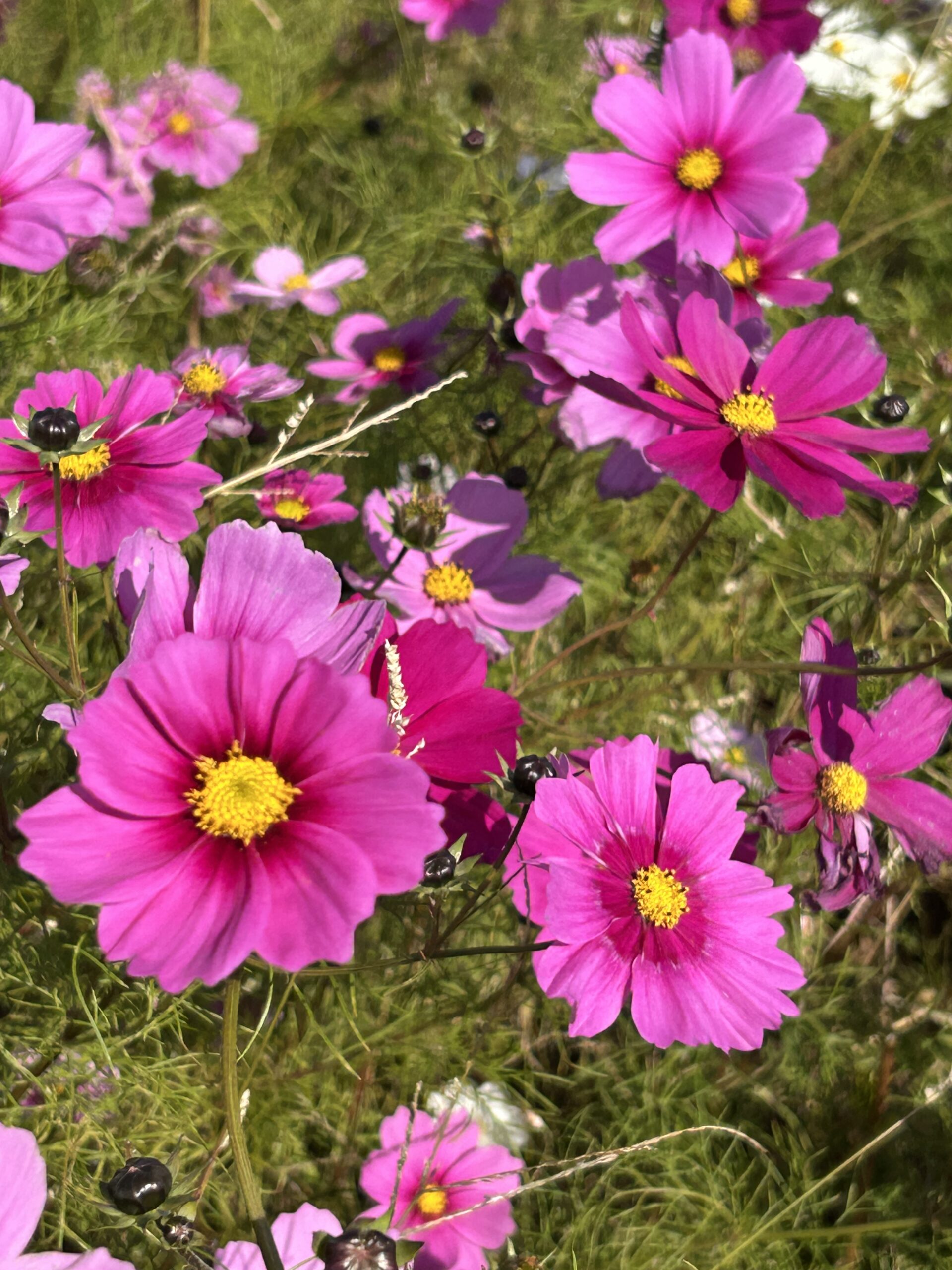 ピンク、赤、白と可愛らしいコスモスがたくさん咲いています。
