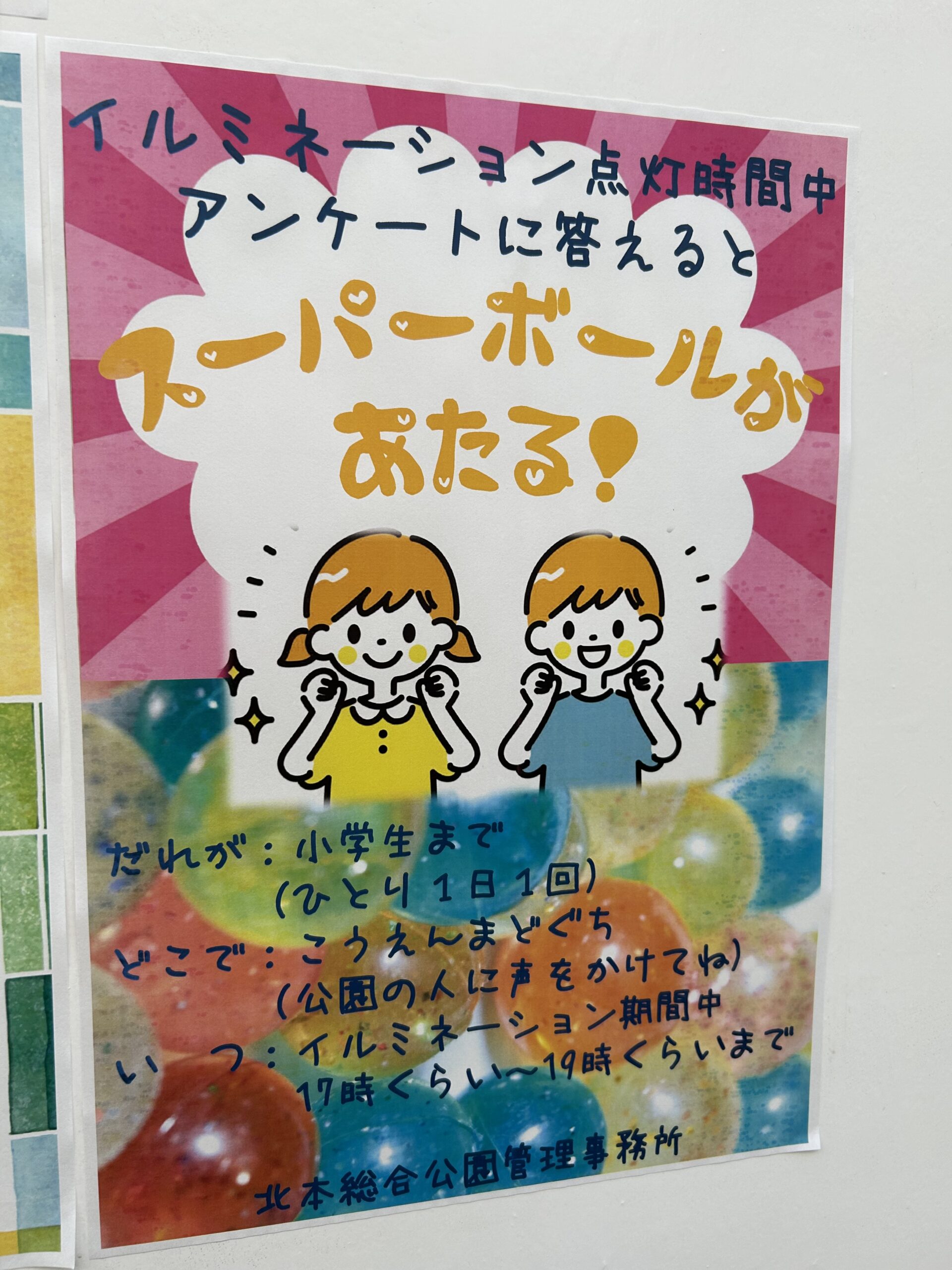 イルミネーションの点灯時間中、アンケートに答えるとスーパーボールが当たるようです。