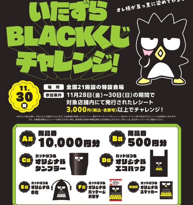 BAD BADTZ-MARU いたずらBLACKくじチャレンジは11月30日に開催されます。