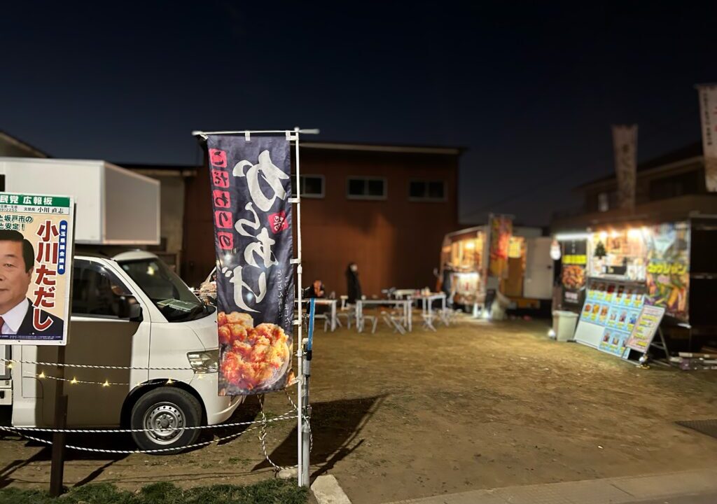 会場の周りにキッチンカーなどの出店者が並んでおり、真ん中には、テーブルや椅子、ライトが用意されていました。