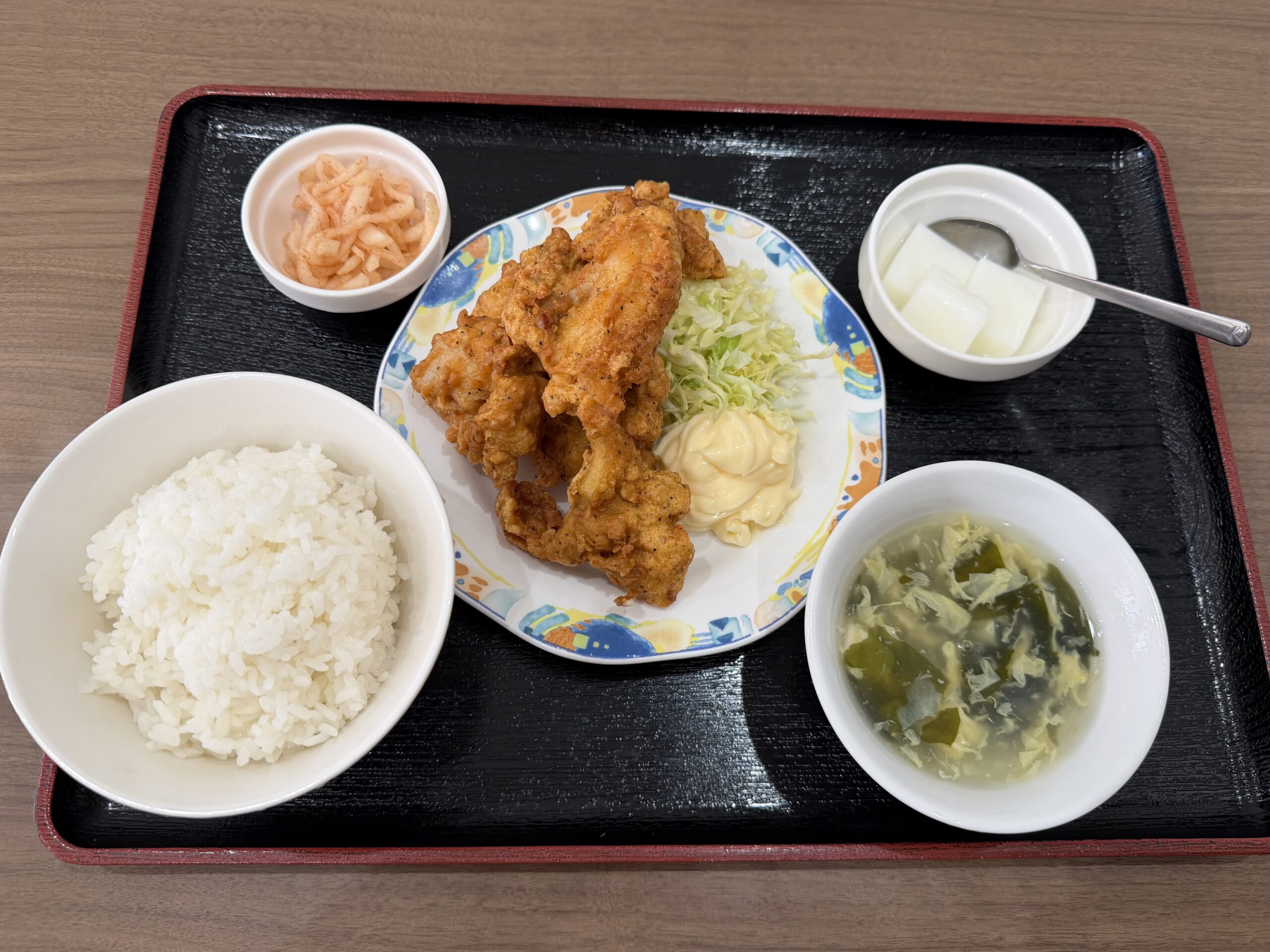 若鶏の唐揚げ定食は、ご飯、スープ、キャベツ、お新香、杏仁豆腐が付いています。