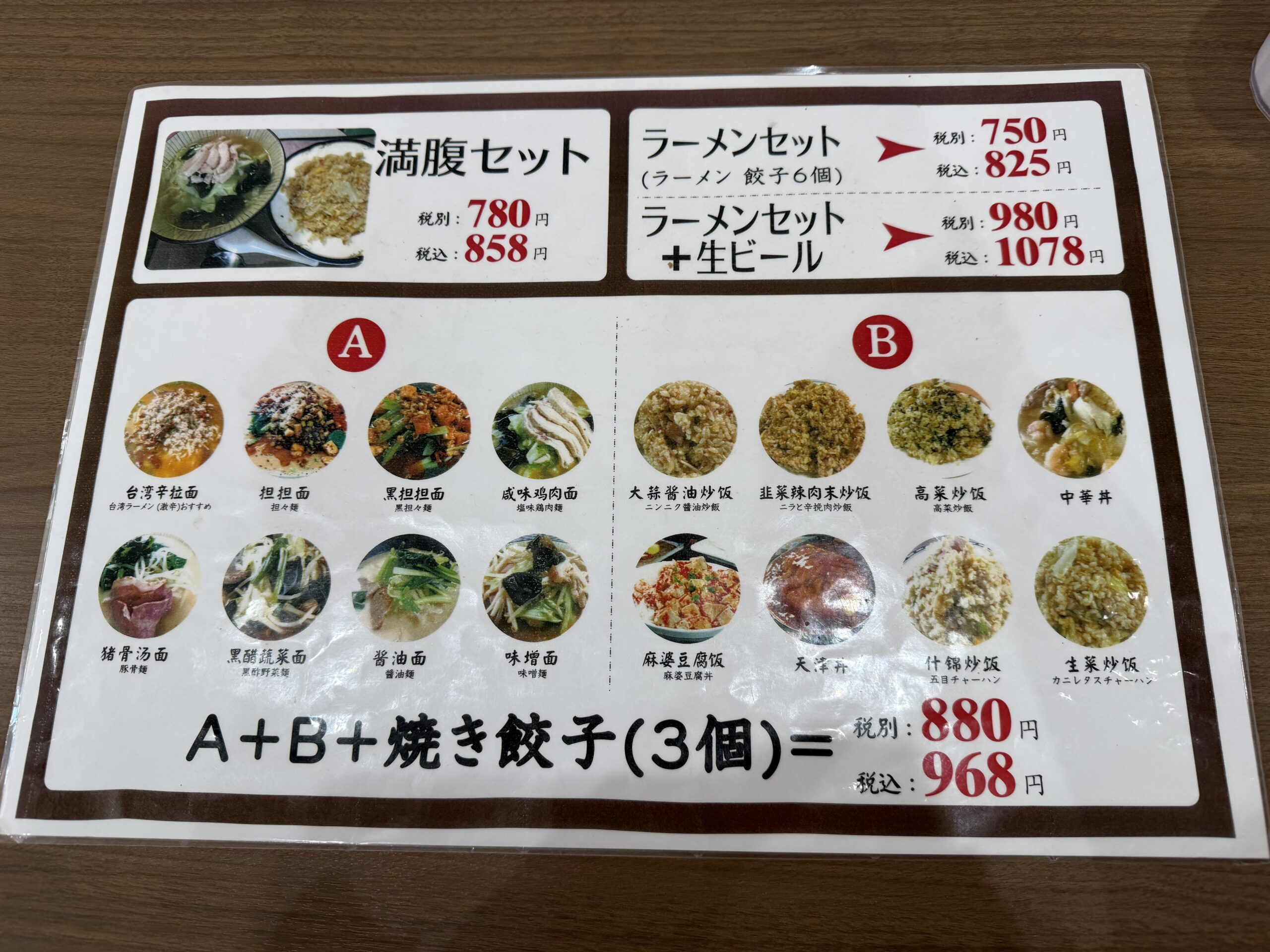 【A:台湾ラーメン・担担麺・黒担担麺・塩味鶏肉麺・味噌麺・醤油麺・黒酢野菜麺・豚骨麺】+【B:ニンニク醤油炒飯・ニラと辛挽肉炒飯・高菜炒飯・中華丼・カニレタス炒飯・五目炒飯・天津丼・麻婆豆腐丼】