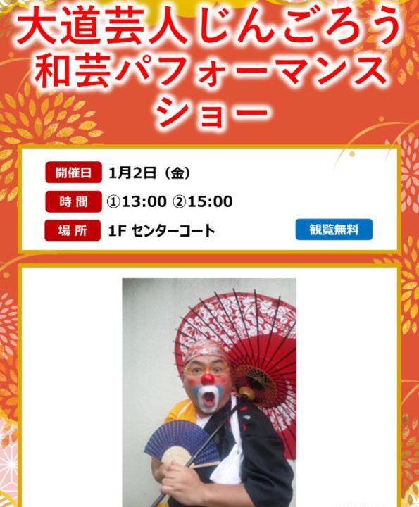 今回はベニバナウォーク桶川で2026年1月2日に大道芸人じんごろう 和芸パフォーマンスショーが開催されるとの情報をいただきましたので共有します。