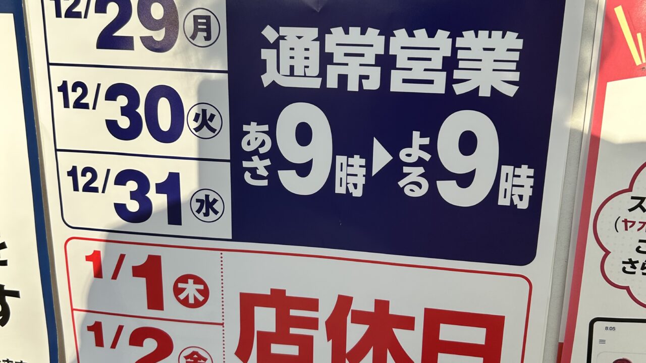 1月1日は休みで、2日と3日は時短営業(9時~18時)になりますのでお間違えのないように!!