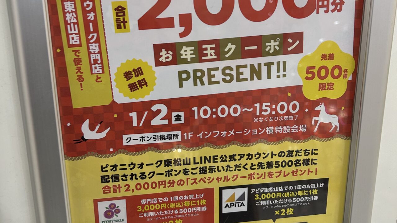 1月2日にピオニウォーク東松山1階インフォメーション横の特設会場で配信されたクーポンを提示すると2000円クーポンがもらえます!