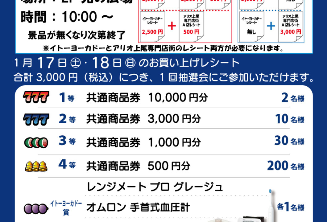 アリオモール専門店街・イトーヨーカドー両方の1月17日(土)・1月18日(日)のお買い上げレシート合計3,000円(税込)につき1回抽選会にご参加できます。