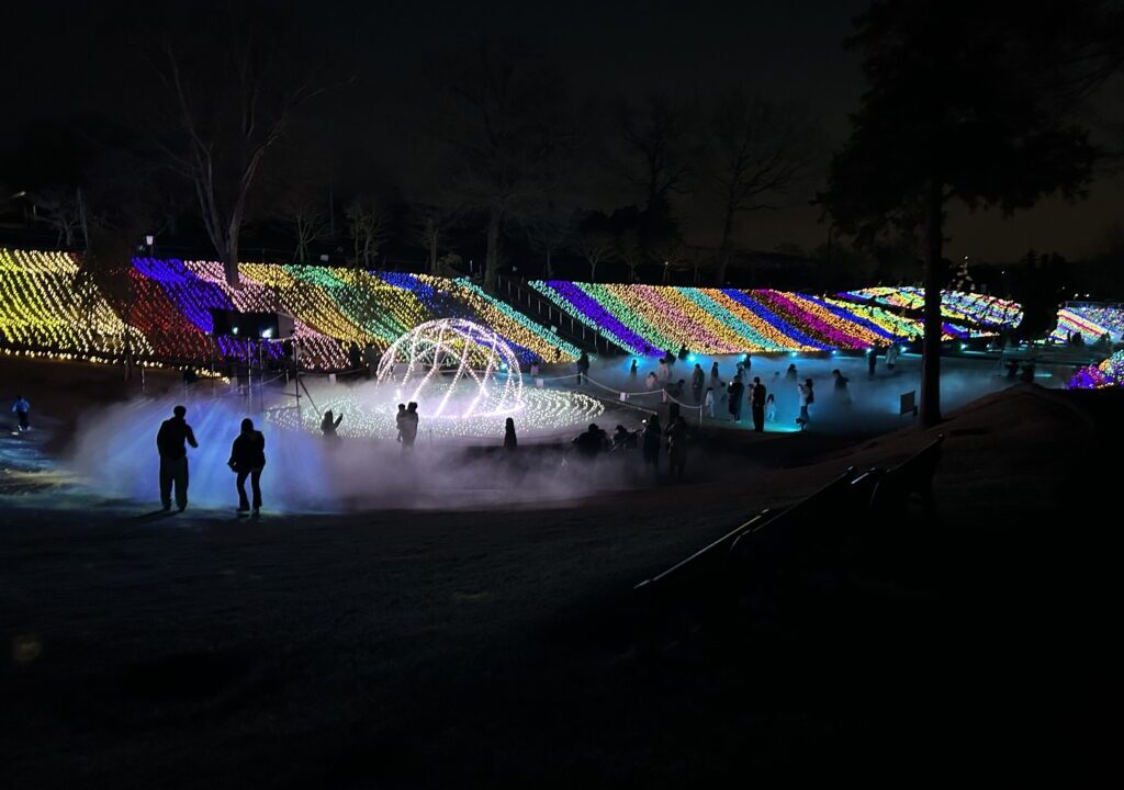 芝生に映し出されたプロジェクションマッピングは子どもたちみんなが光を踏んだり、避けたりピョンピョン大はしゃぎで遊んでいました。この日は18時頃になるとお子さん連れのお客様は徐々に帰られていたので、寒さは厳しくなりますがプロジェクションマッピングをじっくり楽しみたい方は18時頃から入園すると良いかもしれません。