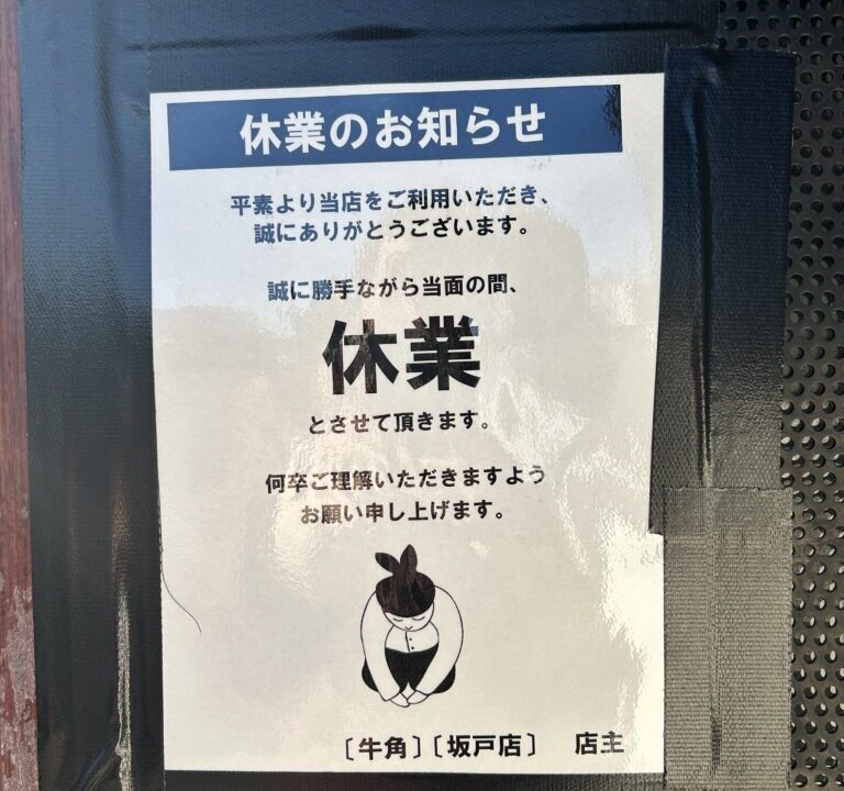 「牛角 坂戸店」の前を通りかかったところ、休業のお知らせが掲示してありましたので情報を共有します。