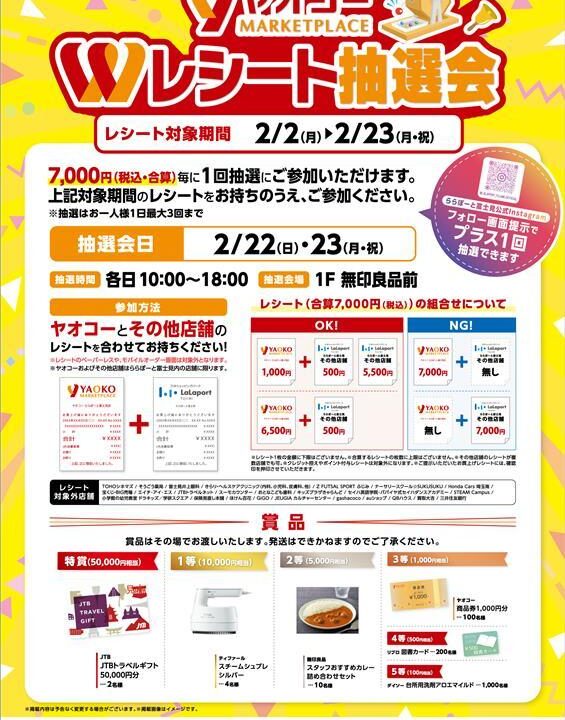 ヤオコーWレシート抽選会は2月22日・2月23日に開催されます。
