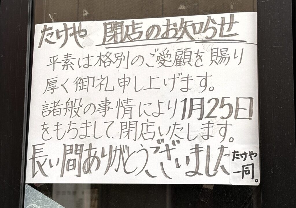 今回は鴻巣市にある「たけや」が閉店していた情報です!