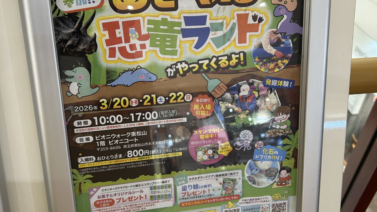 今回はピオニウォーク東松山で『あそべぇる恐竜ランド』が開催されるので情報を共有します。