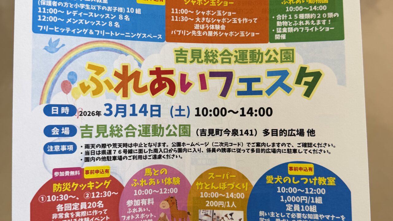 ふれあいフェスタは3月14日に吉見総合運動公園で開催されます。
