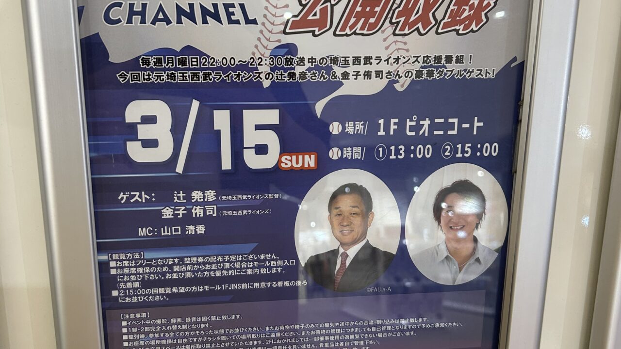 今回はピオニウォーク東松山で、テレ玉『ライオンズチャンネル』公開収録がされるので情報を共有します。