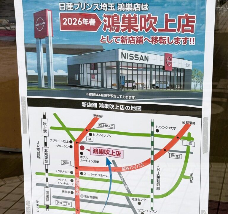 今回は鴻巣市にある「日産プリンス埼玉 鴻巣店」が移転する情報です。