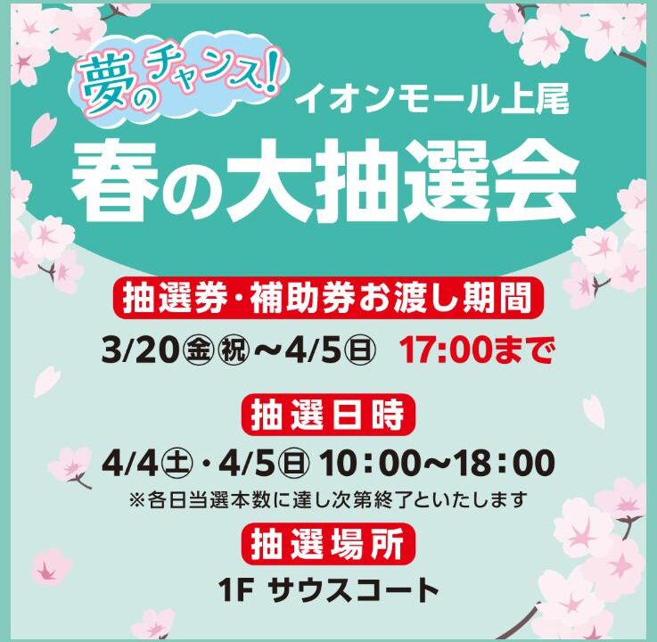 イオンモール上尾 春の大抽選会は4月4日 (土) と4月5日 (日)に開催されます。