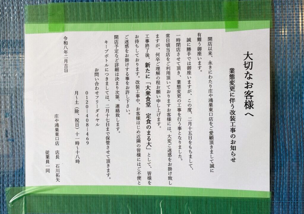 今回は鴻巣市にある「庄や 鴻巣東口店」が閉店していた情報です!