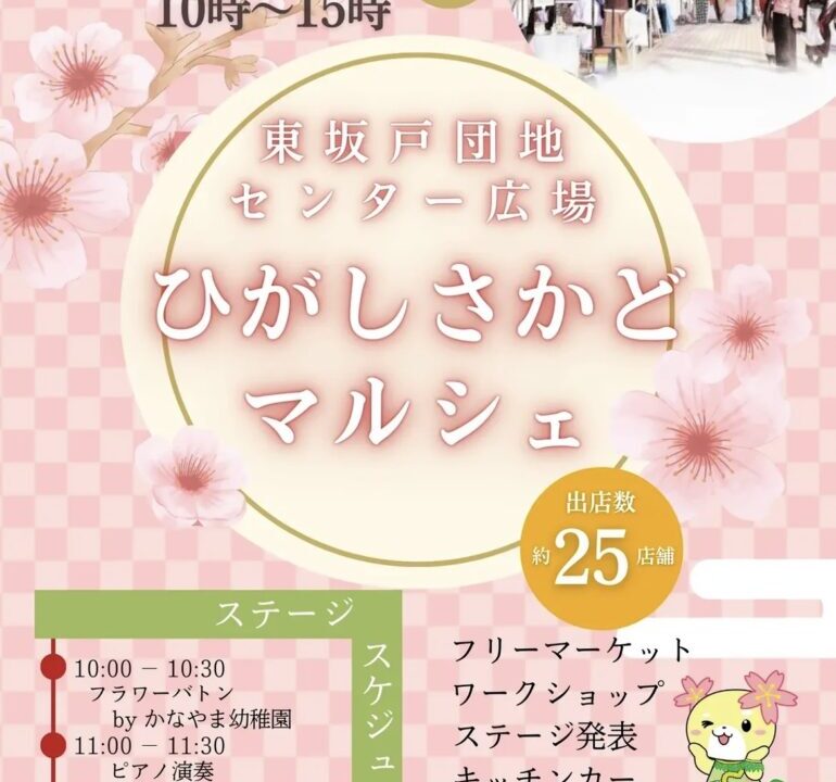 今回は東坂戸団地センター広場で開催される「ひがしさかどマルシェ」の情報です。