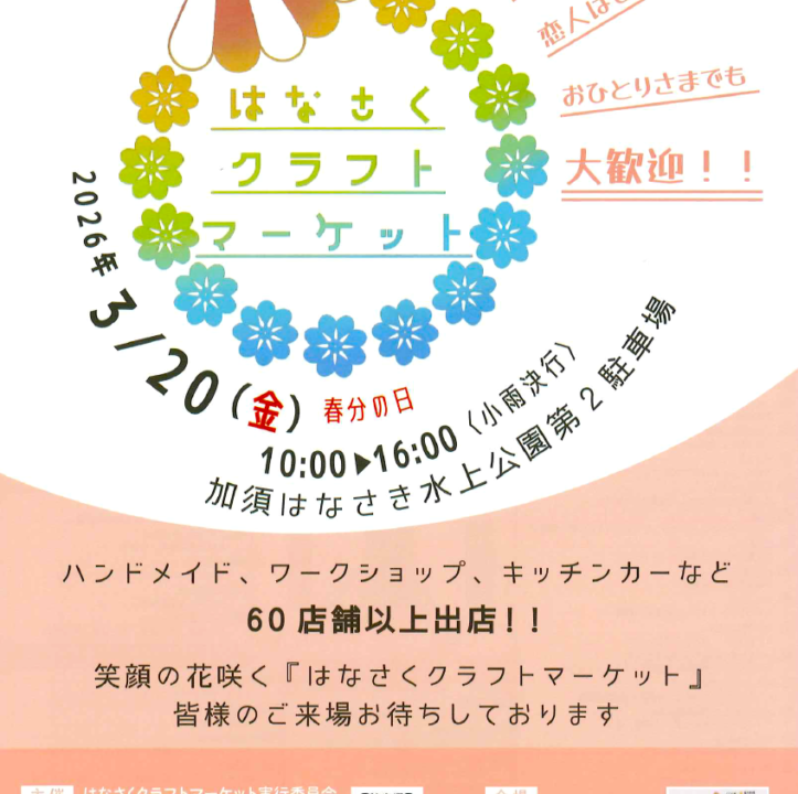 いよいよ明日、3月20日(金・祝)は、加須はなさき公園で「第6回 はなさくクラフトマーケット」が開催されます!
