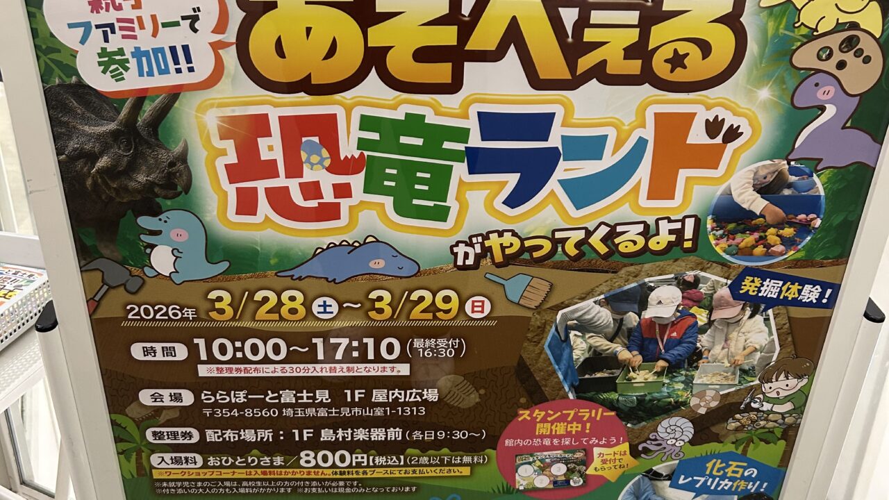 今回はららぽと富士見で『発掘!あそべぇる恐竜ランド』が開催されるので情報を共有します。