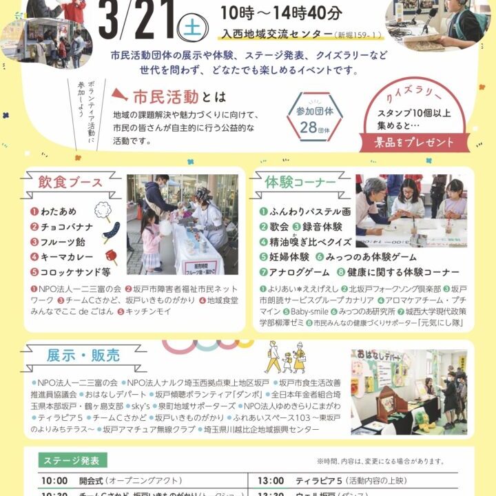 チームCさかど・坂戸いきものがかりによるトークショーや、ウェル坂戸のバレエ・チャレスポ、和太鼓煌による和太鼓演奏、ティラピア5の活動内容の上映、ウェル坂戸のダンス発表、北坂戸フォークソングクラブの歌会を披露してくださるようです。
