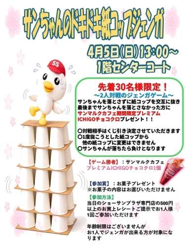 サンちゃんのドキドキ紙コップジェンガは4月5日に開催されます。