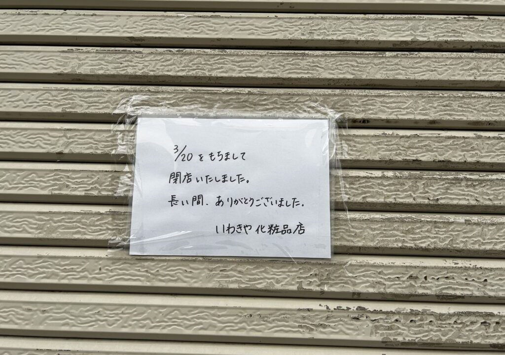 閉店情報 【坂戸市】残念ながら「いわきや 化粧品店 坂戸店」が閉店していました。 まっすー 2026年4月2日 掲載情報は当時のものです。 スポンサーリンク 埼玉マガジンライターのまっすーです。 今回は「いわきや 化粧品店 坂戸店」が、2026年3月20日(金)に閉店していたので情報を共有します。 スポンサーリンク 場所はここ 店名 いわきや 化粧品店 坂戸店 住所 〒350−0214 埼玉県坂戸市千代田1-9-4 最後に 様々なコスメブランドの商品を取り扱っていた「いわきや 化粧品店 坂戸店」。 地域に密着したお店で利用していた方も多いと思います。 閉店となり残念ですね。 最後までご覧いただきありがとうございました。 坂戸市 ABOUT ME まっすー 坂戸市・東松山市・鶴ヶ島市を担当する「まっすー」です。 2025年7月から埼玉マガジンのライターとして活動を開始しました。 坂戸市在住の30代主婦。 皆様に主婦目線の情報を提供していきます。 スポンサーリンク