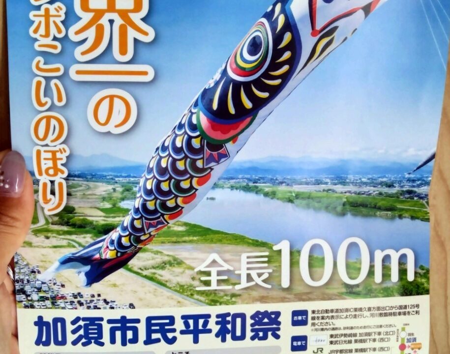 加須市の初夏の風物詩、全長100メートルを誇る「ジャンボこいのぼり」が今年も利根川の空を泳ぎます!