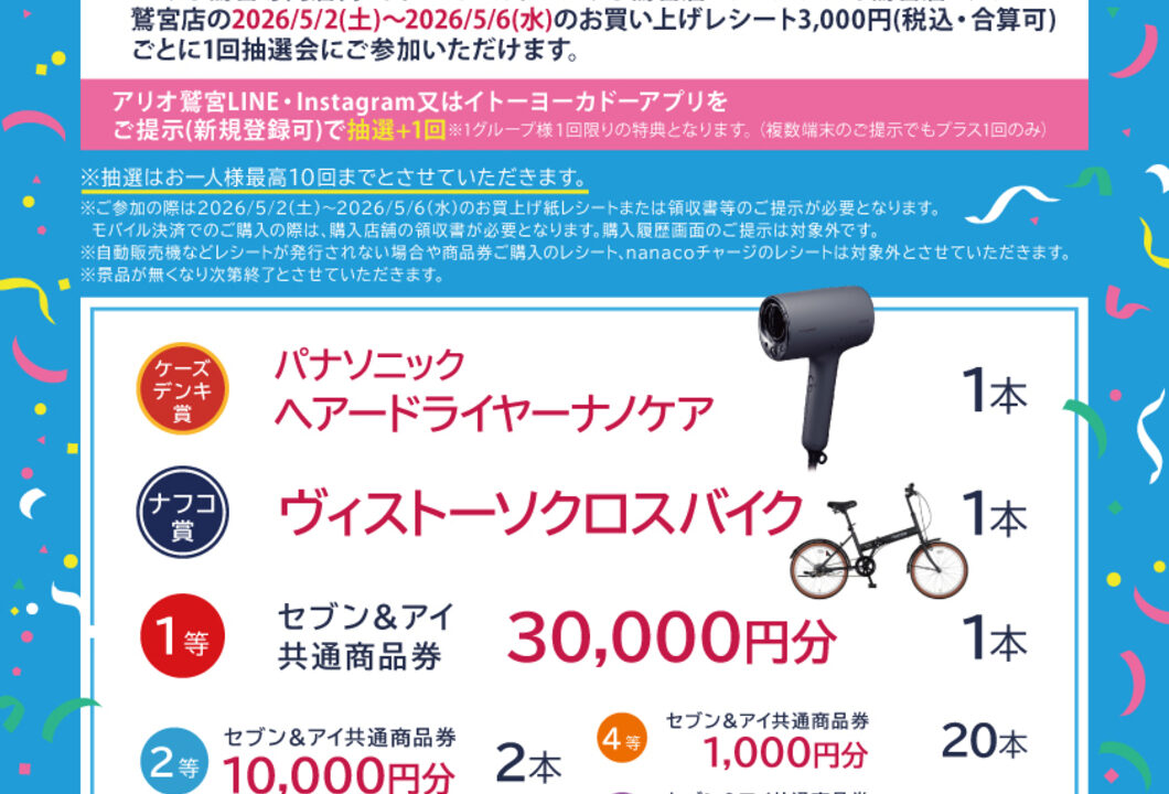 抽選会には、アリオ鷲宮専門店街・イトーヨーカドーアリオ鷲宮店・ケーズデンキ鷲宮店・ナフコ鷲宮店の5月2日(土)~5月6日(水)のお買い上げレシート3,000円(税込・合算可)ごとに1回抽選会に参加できます。