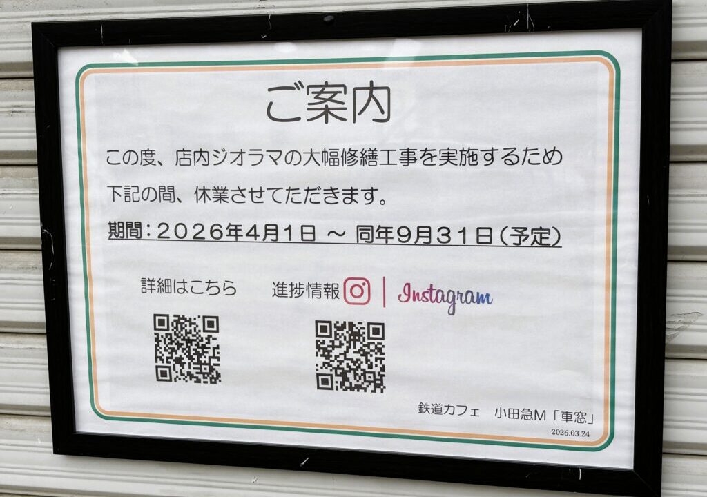 最新情報 【鴻巣市】「鉄道カフェ 小田急M 車窓」が大幅修繕工事のため休業中!営業再開はいつ? あい 2026年4月19日 掲載情報は当時のものです。 スポンサーリンク 埼玉マガジンライターのあいです。 今回は鴻巣市にある「鉄道カフェ 小田急M 車窓」が現在大幅修繕工事のため休業中の情報です。 場所はこちら 北本駅西口から徒歩6分ほど。 小田急マンションの1階にあります。 鴻巣市小松4-2-27 小田急マンションB101 現在休業中! 2026年4月1日~9月31日まで休業予定 詳細はこちら ジオラマ線路の劣化消耗、ポイント不具合、遮断機システムの不具合等の問題から大規模修繕工事実施のため長期休業となっています。 工事の進歩情報などはInstagramにて発信されるようですよ。 最後に 以上「鉄道カフェ 小田急M 車窓」の休業情報でした! 鴻巣市 ABOUT ME あい 北本市・鴻巣市・桶川市担当の「あい」です! アメブロの経験を生かしてライターとして活動していきます。 皆さんのお役に立てるように頑張っていきます。 よろしくお願いします。 スポンサーリンク